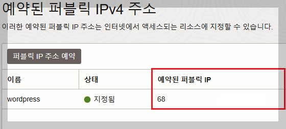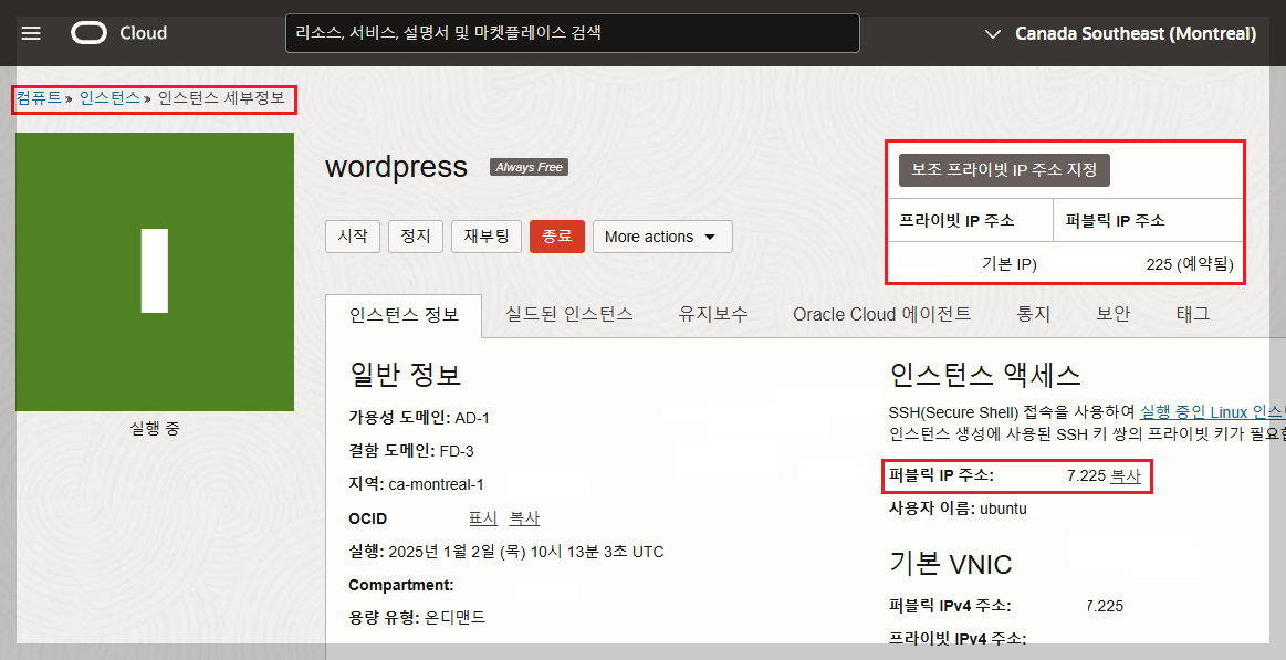 변경된 퍼블릭 IP 주소가 컴퓨트 - 인스턴스 - 이름 으로 진입해서 볼 수 있는 퍼블릭 IP 주소와 동일한지 확인하세요.