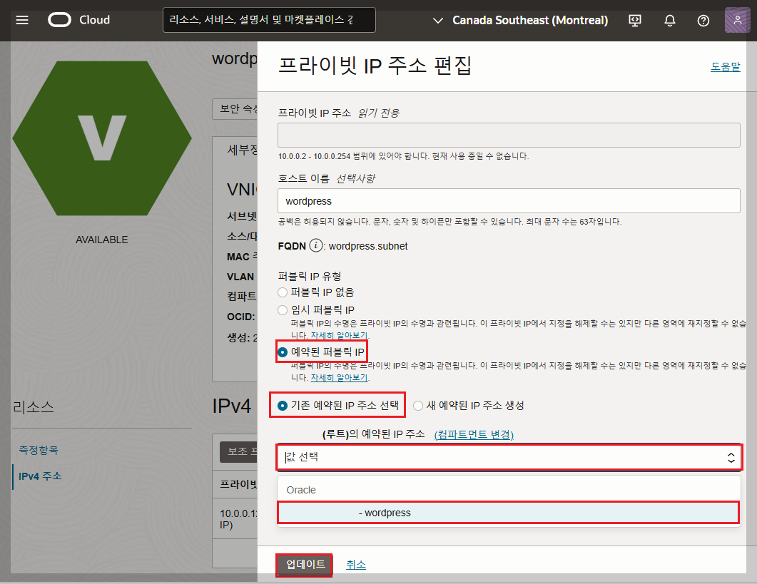 예약된 퍼블릭 IP - 기존 예약된 IP 주소 선택 - 생성했던 IP - 업데이트 를 선택합니다.