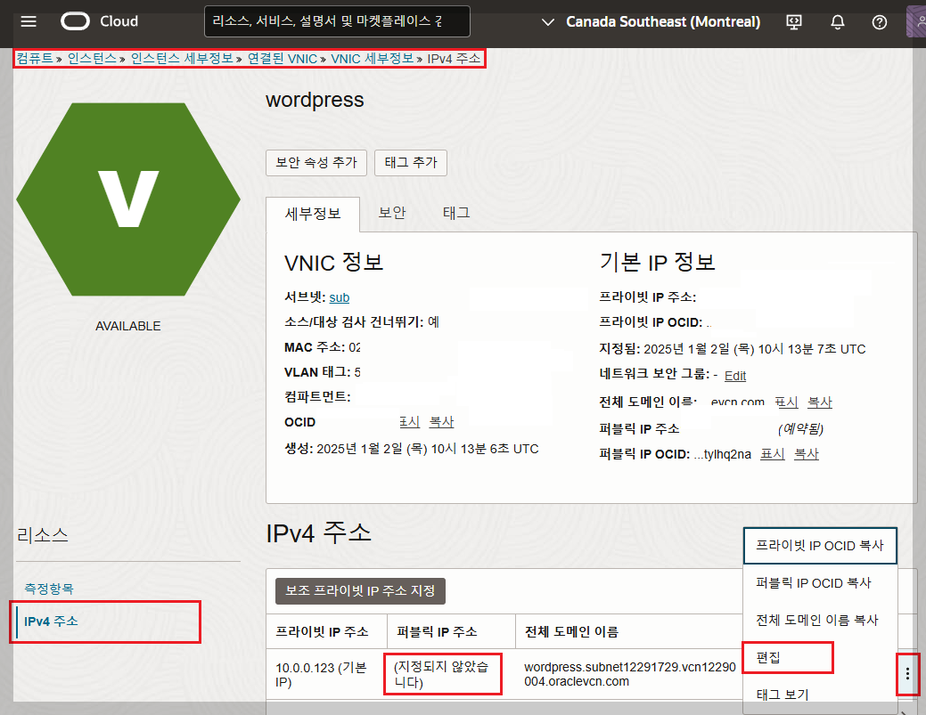 지정되지 않은 퍼블릭 IP 주소를 변경하기 위해 오른쪽의 점 세개 - 편집을 눌러주세요.