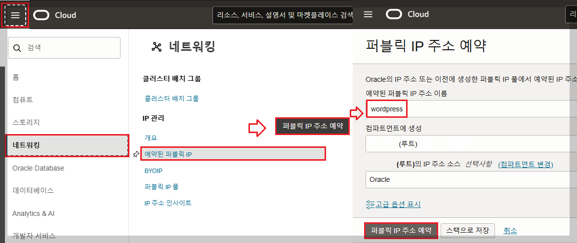 좌상단 메뉴 - 네트워킹 - 예약된 퍼블릭 IP - 퍼블릭 IP 주소 예약 순서로 진입해서 퍼블릭 주소를 예약합니다.